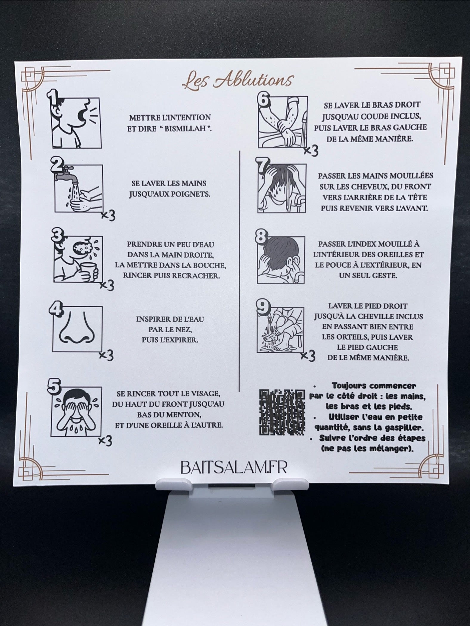 Un sticker pédagogique illustré présentant les 9 étapes du Wudu, conforme à la tradition prophétique. QR CODE pour la vidéo explicative intégré.