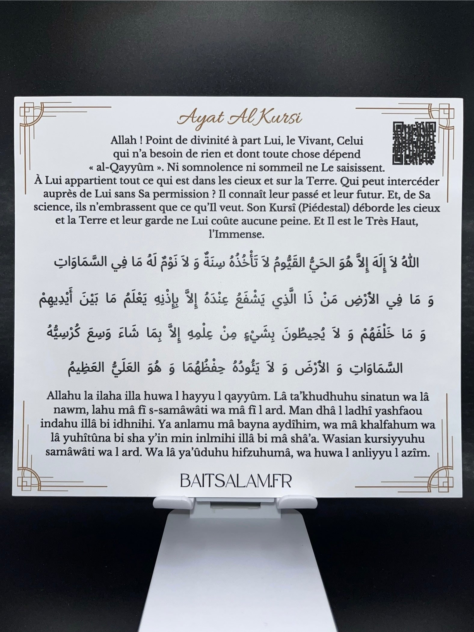 Ayat al-Kursi (Sourate Al-Baqara, verset 255) est l’un des versets les plus puissants du Coran. Ce sticker Ayat al-Kursi en fond blanc constitue un rappel spirituel fort et un moyen de protection au quotidien. QR CODE pour la prononciation intégré.